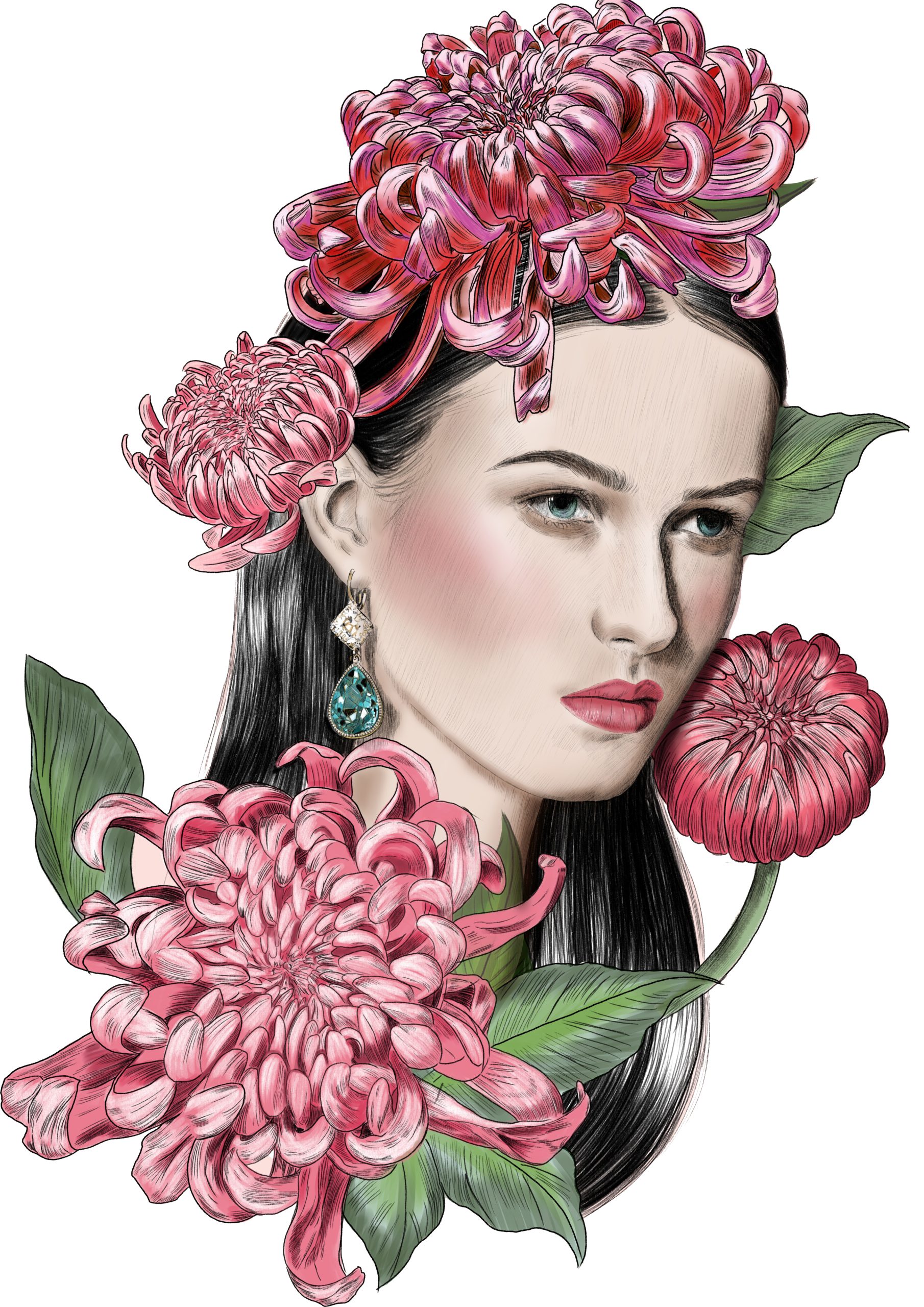 Between graphite and digital light, this series (2019–2022) marks a stage of transition and discovery. Through the feminine portrait, I explored the language of beauty as a reflection of the soul: faces surrounded by flowers, jewels, and chromatic veils that speak of sensitivity, strength, and transformation.
