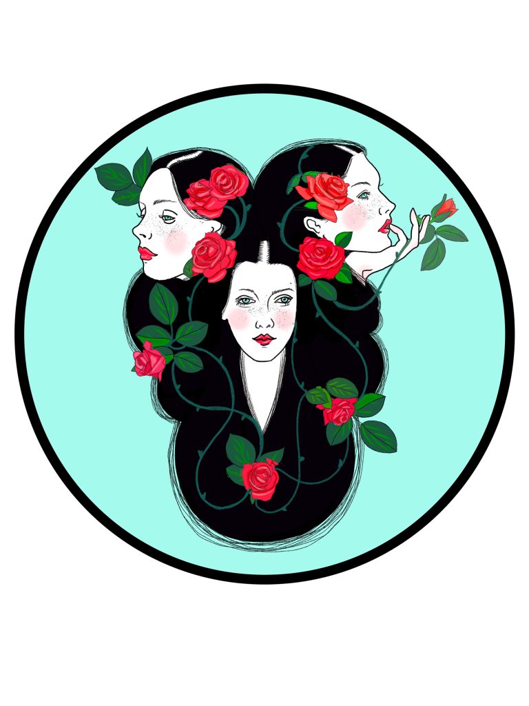 Una figura femenina enmarcada por un rosal trepador. Con una rosa entre los labios, representa la unión entre deseo y contención, belleza y herida. Es la voz del cuerpo que habla en silencio, el eco del tango y la pasión que atraviesa el tiempo.