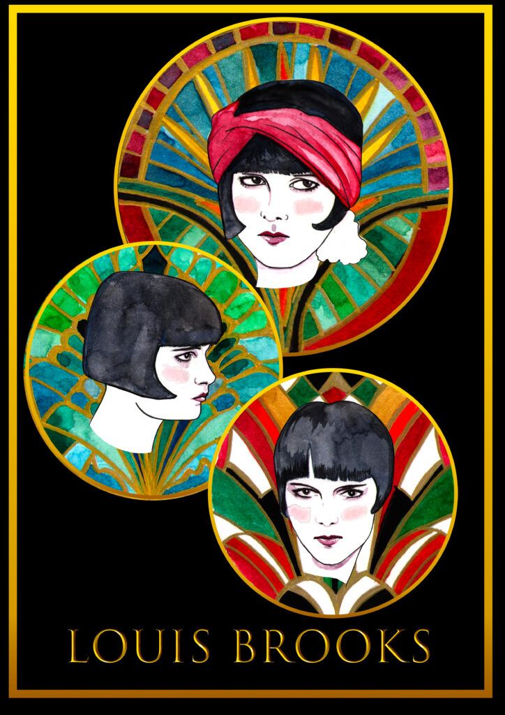 Retratos inspirados en la actriz del cine mudo que encarnó la revolución de los años veinte. Su cabello oscuro y su mirada directa se convierten aquí en emblemas de autonomía y desafío. Louise Brooks aparece como una musa del cambio: libre, moderna, eterna.